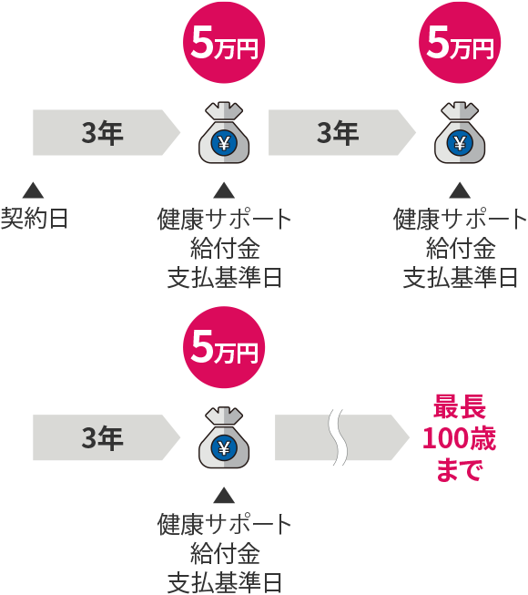健康サポート特則を付加した場合、3年ごとに病気・ケガによる短期疾病入院一時金、短期災害入院一時金のお支払いがなければ、最長100歳まで、3年ごとに5万円が受け取れます。